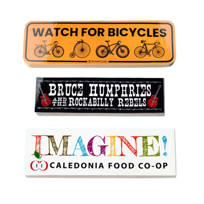 Bumper Stickers Printing OptionsHeightYou can print full color on the front or on both sides of your flat piece. For folded products you can print full color on the outside or the outside and inside of your piece. Paper You can select one of several premium paper types for your piece. Vinyl (UV Coating) Durable vinyl sticker paper with a high-gloss UV coating and crack-and-peel backing. The vinyl material and UV coating make this stock ideal for outdoor applications or any piece requiring a durable finish and eye-popping colors. Material Type: Vinyl Sticker Thickness: 3.4 mil Color: White Temperature Range: -10°F to +200°F Backing: Crack-and-Peel Backing Indoor Use: Yes Outdoor Use: Yes |
